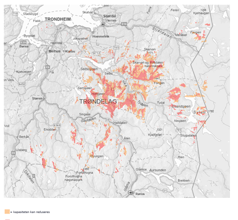Under er et kartutsnitt av området som vil kunne oppleve periodevis redusert kvalitet eller manglende dekning i forbindelse med arbeidet.