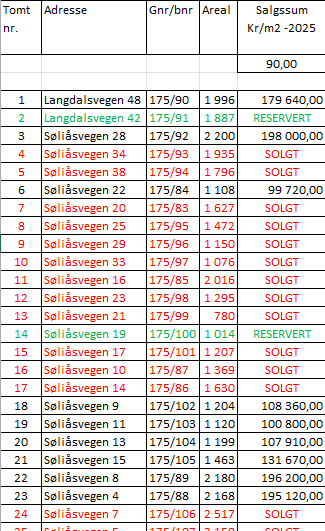 Oversikt over tomter og priser i Søliåsen boligfelt
